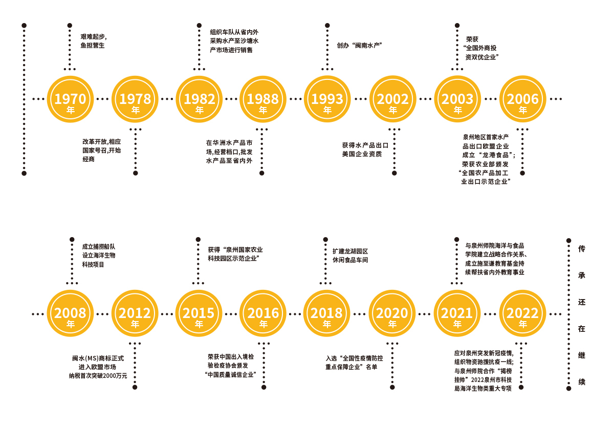 ●初具规模(施至谦 先生) 施至谦先生自幼追随父亲走街串巷、买卖鱼获,淬炼出吃苦耐劳的精神品质,更培养出异常敏锐的市场嗅觉。 19岁时, 他便以脚踏车代步,将父亲的鱼担买卖扩大了范围。 1978年,党的十一届三中全会召开,开启了改革开放的伟大征程。已从事多年鱼获买卖的施至谦先生,敏锐地捕捉到即将到来的时代巨变。在父亲的全力支持下,他决定响应国家号召,深入拓展水产批发业务。 1982年,从梅林码头起步通过拖拉机车队,将水产运至沙塘水产市场进行销售。 1983年,成立车队,从厦门沙坡尾鱼市场采购渔获,销售至沙塘水产市场。 1984年,开始承包石狮水产公司位于沙塘市场的冻库,进行水产批发业务。 1988年,随着沙塘水产市场的迁移,他的业务中心转移到当时福建最大的水产批发市场——华洲水产批发市场。并从这里开始,业务逐步走向全国。 1993年,创立“闽南水产”进行水产品加工和储存业务,为日后企业的发展打下基础。 1999年,投资收购渔船进行海上渔获的集中采购,从此开始专注“一条鱼”的经营。 2002年,“闽南水产”加工的鱿鱼产品开始出口美国。 2006年,“闽南水产”成为泉州首家水产品推向欧盟的企业。同年,“龙港食品”正式成立,开始鱼糜深加工业务。 2008年,为获得更稳定的原料供应来源,投资运营捕捞船队。为了再次完善公司产业链,他成立生物科技项目,深挖掘水产品价值…… |