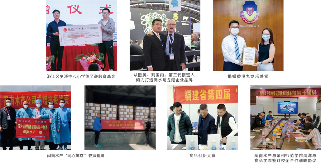 社会责任 闽南水产的今天,离不开党和国家的改革开放政策,也离不开各级领导的亲切关怀。公司成立以来,各级政府领导同志多次莅临公司指导,并对闽南水产的发展给予指导,鼓舞着闽水人乘风破浪,勇往直前。 公司还与国家海洋局第三海洋研究所、厦门大学海洋学院、泉州师范学院海洋与食品学院签订校企合作战略协议,在课题研究、产品研发、实验室共建、学生实践就业等方面,相关合作已经有序推进。 一直以来,公司始终坚守初心和使命,加快发展步伐的同时,积极践行责任担当。向公益扶贫、救灾救险、乡村建设、教育事业、养老事业等公益领域持续投入。 闽南水产成立专项慈善基金定向、持续捐助教育事业,先后捐建福建三明市尤溪施至谦希望小学、设立泉州市洛江区罗溪中心小学施至谦教育基金、设立云南省文山壮族苗族自治州丘北县曰者镇中心小学施至谦教育基金。同时捐助香港九龙乐善堂等慈善事业,尽己所能为公益事业添砖加瓦。 2020年1月,全球突发新冠疫情,闽南水产坚持“疫情防控,保障生产”为省内外民生物资的稳定持续供应贡献力量。2022年3月,福建泉州、宁德等地爆发疫情,闽南水产响应号召全力开动生产线,组织抗疫物资送抵抗疫一线。 |